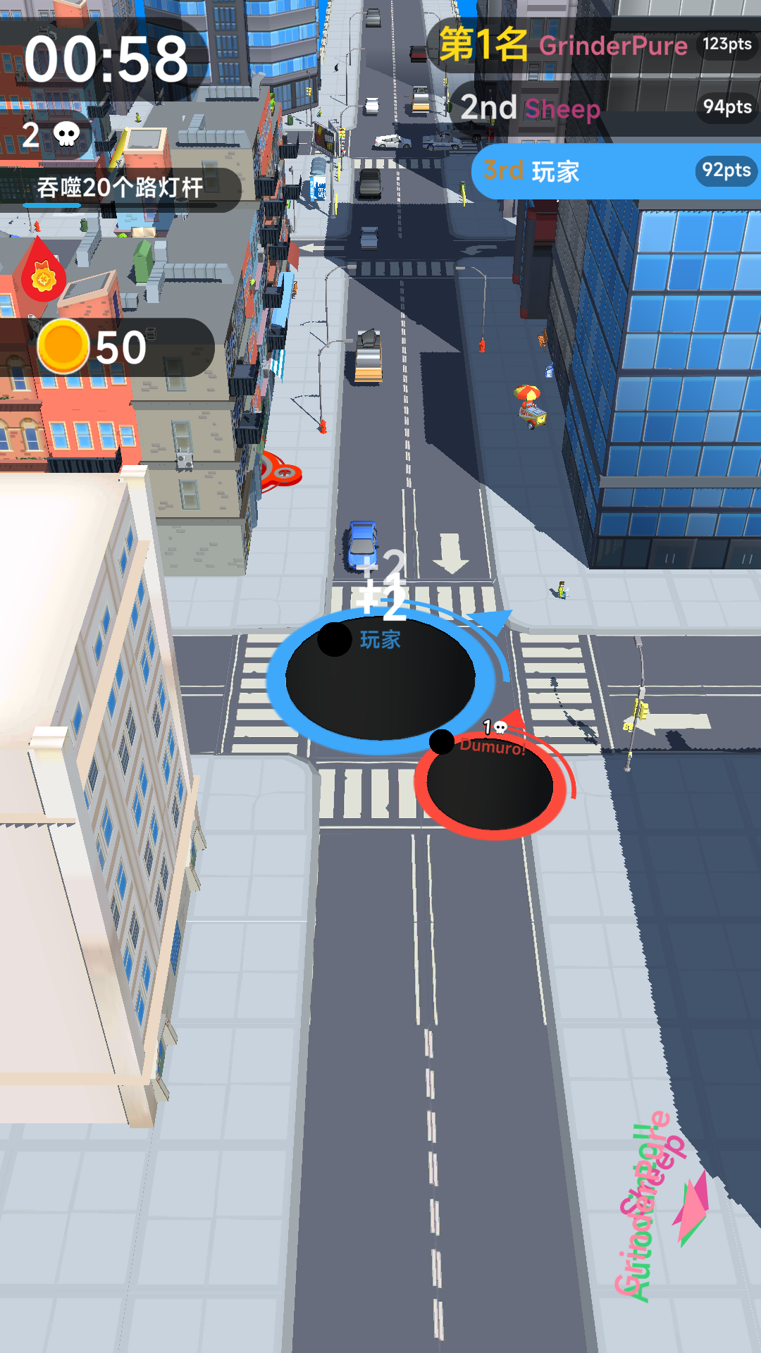 1、通过滑动屏幕或虚拟摇杆控制黑洞移动,靠近目标后自动吞噬,避免与大型物体或对手黑洞正面冲突;