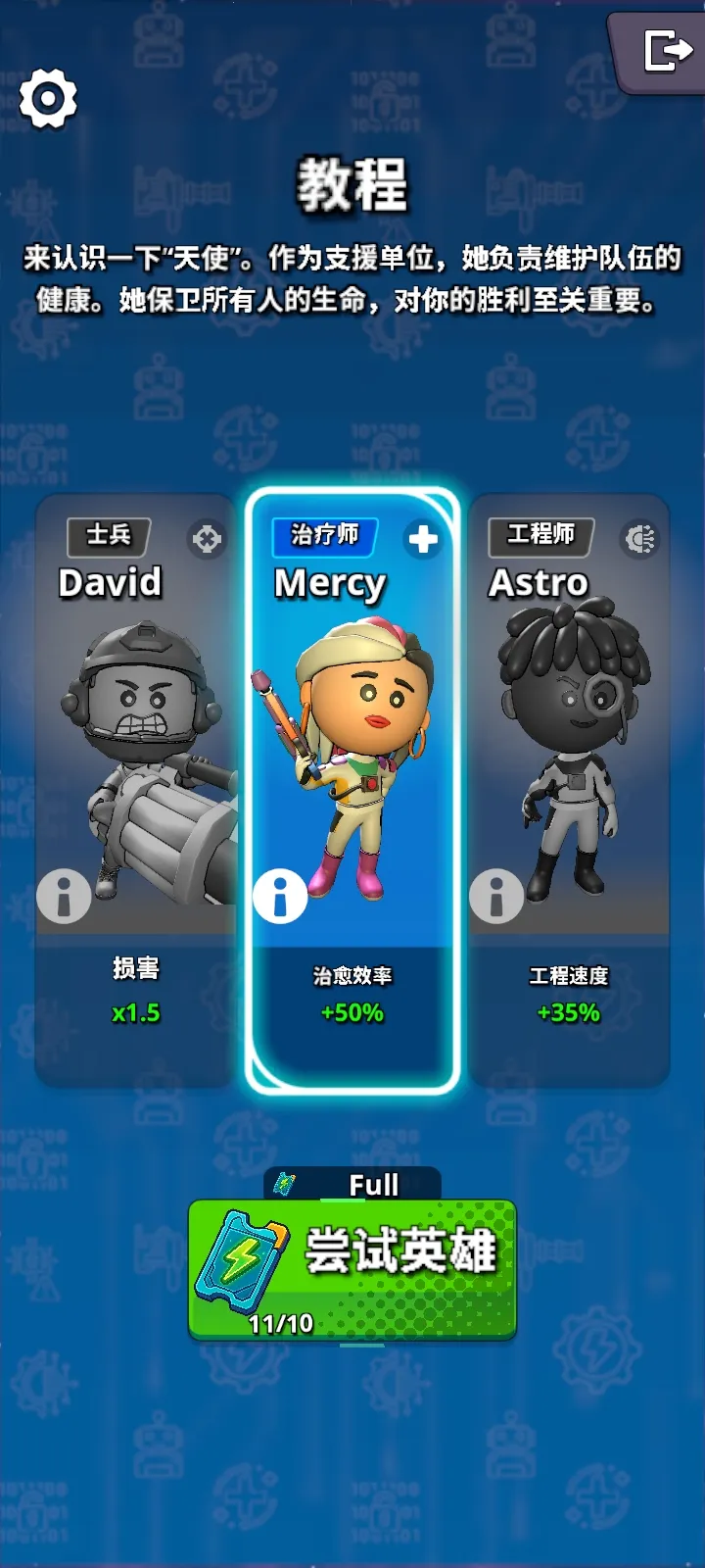 1、三位英雄各具专属能力体系,职业分工明确,需根据关卡机制灵活切换以优化通关效率。