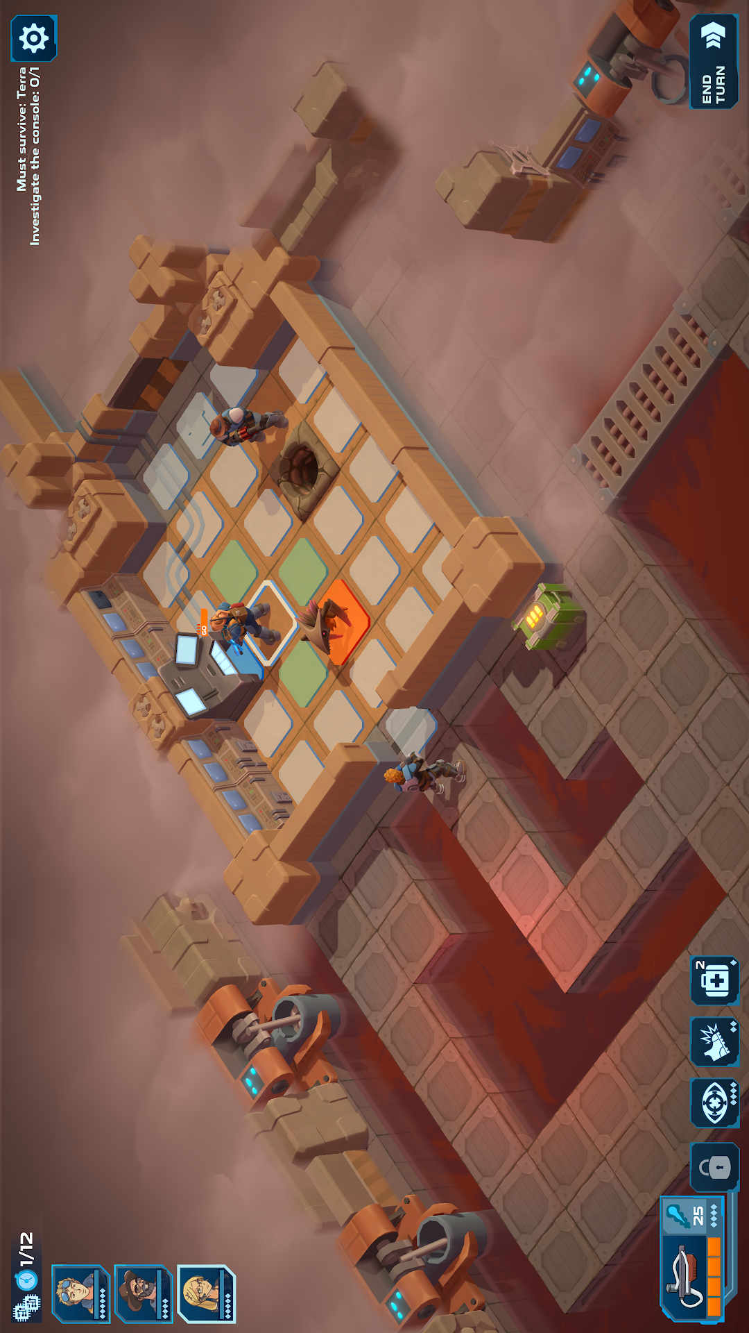 2、每位英雄都有一定的行动点数,移动灰色方块,从绿色方块射击,红色高亮方块是攻击目标。