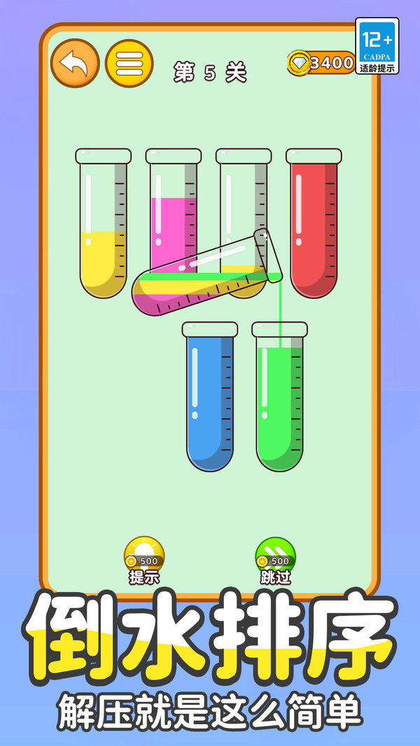4、试管溜溜球中,则需要将试管中的水根据颜色分装到一起过关。