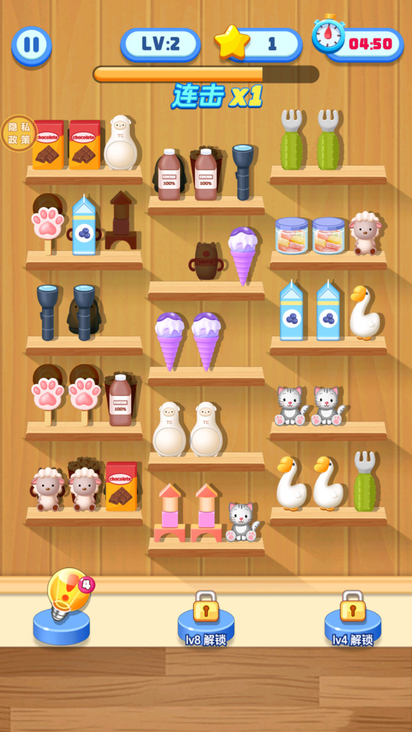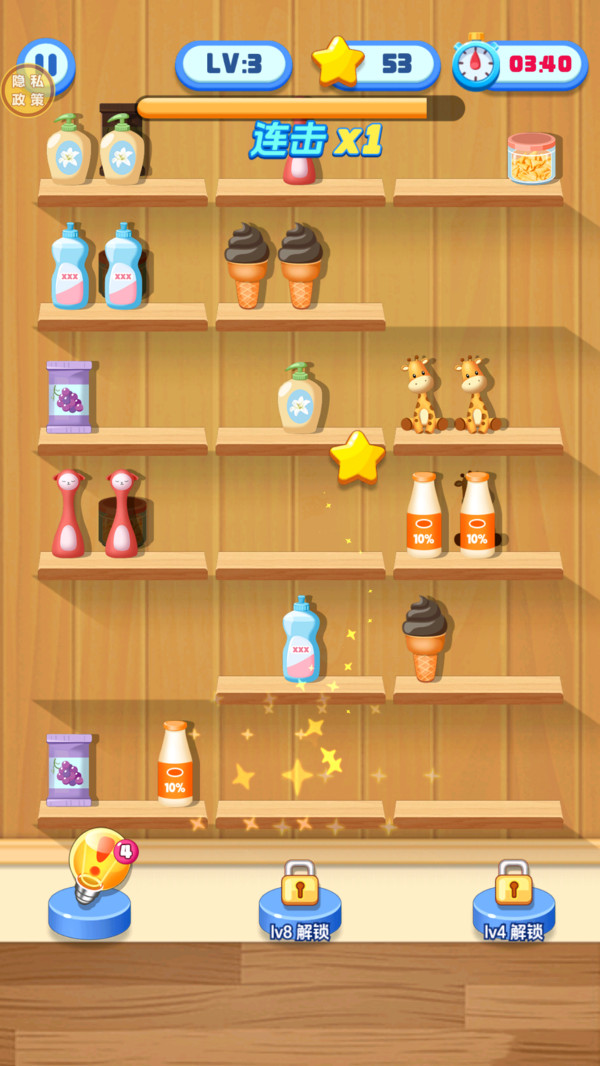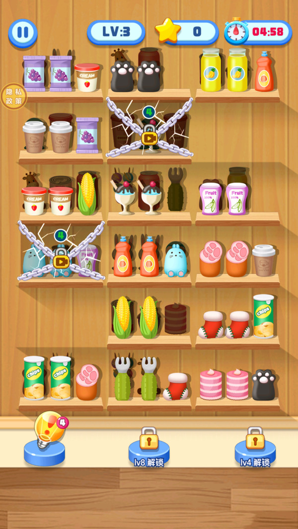 4、在关卡中,通过将相同的三个物品挪到同一个货架上即可消除。