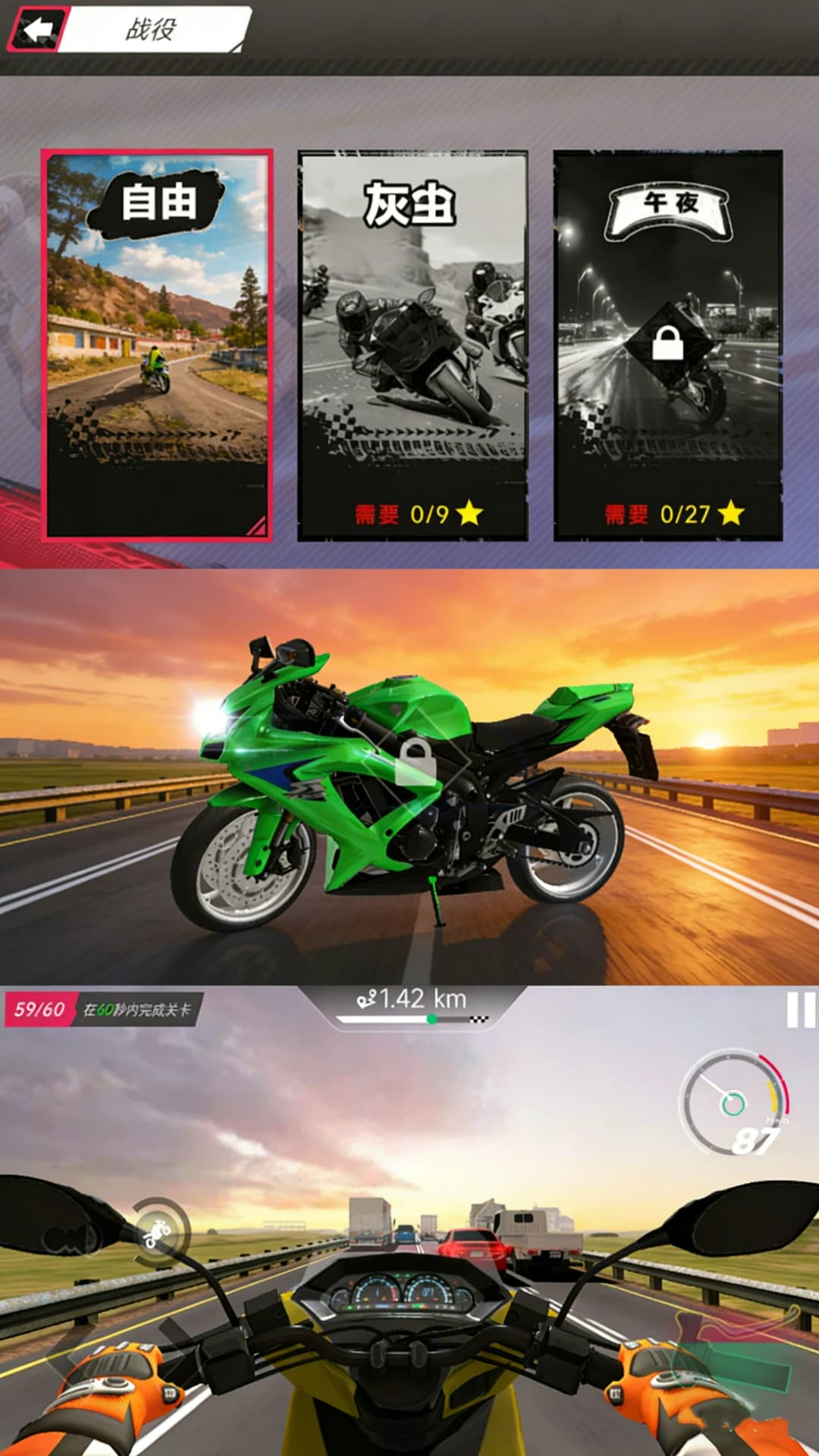 2、提供了多种不同性能的摩托车供玩家解锁,从灵活的街车到强劲的跑车。通过升级来提升爱车属性。