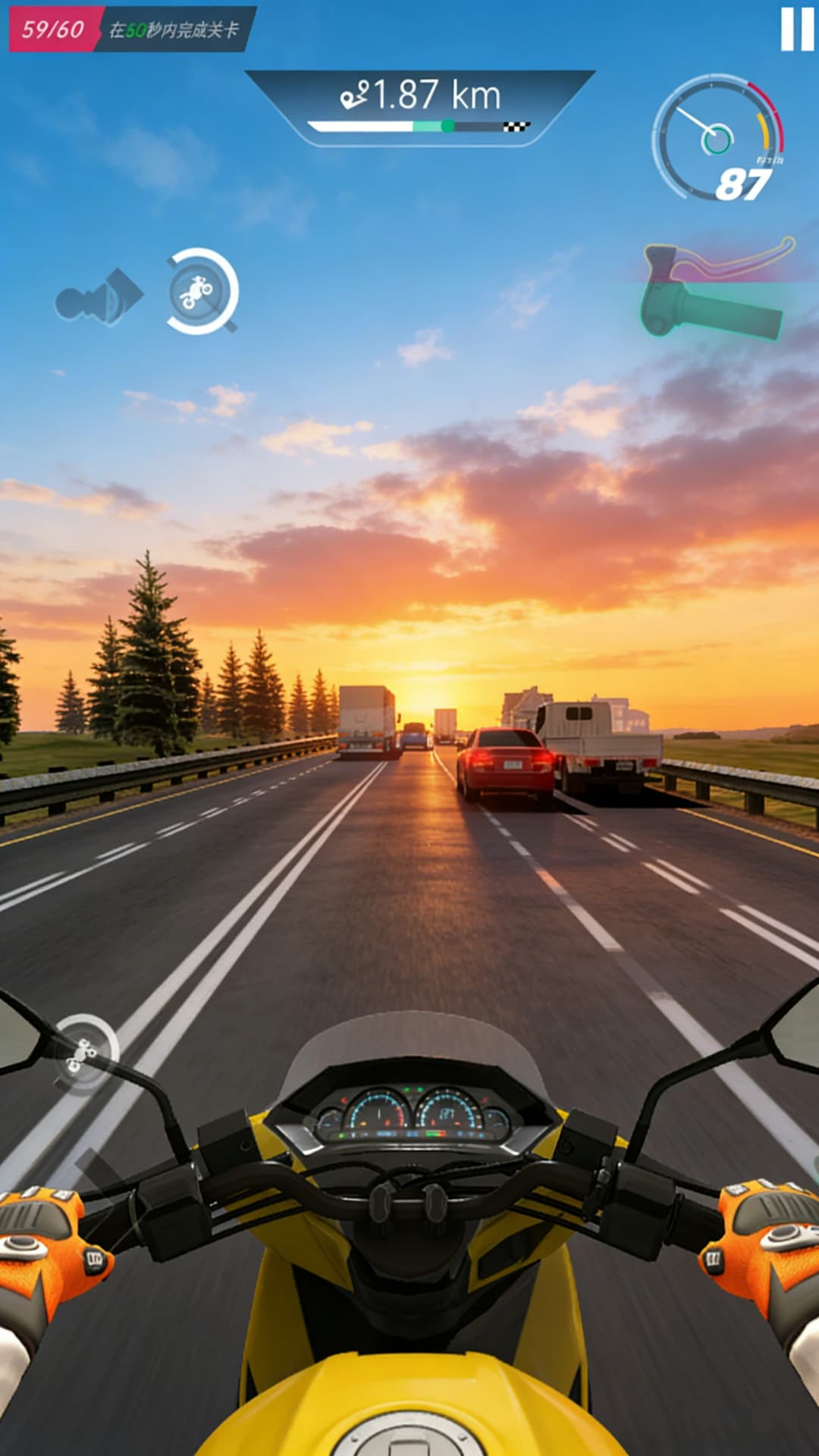 霹雳摩托是一款令人肾上腺素飙升的摩托车竞速游戏。玩家将扮演一名骑行高手,在永不停息的汹涌车流中高速穿梭。您需要精准操控摩托车的方向与速度,在毫厘之间闪避前方不断出现的汽车、卡车与各类障碍,以追求更远的行驶距离和更高的分数。通过完成任务,您可以解锁并升级众多炫酷的摩托车,提升其性能,让每一次拧动油门都成为一次对技术与反应极限的考验。