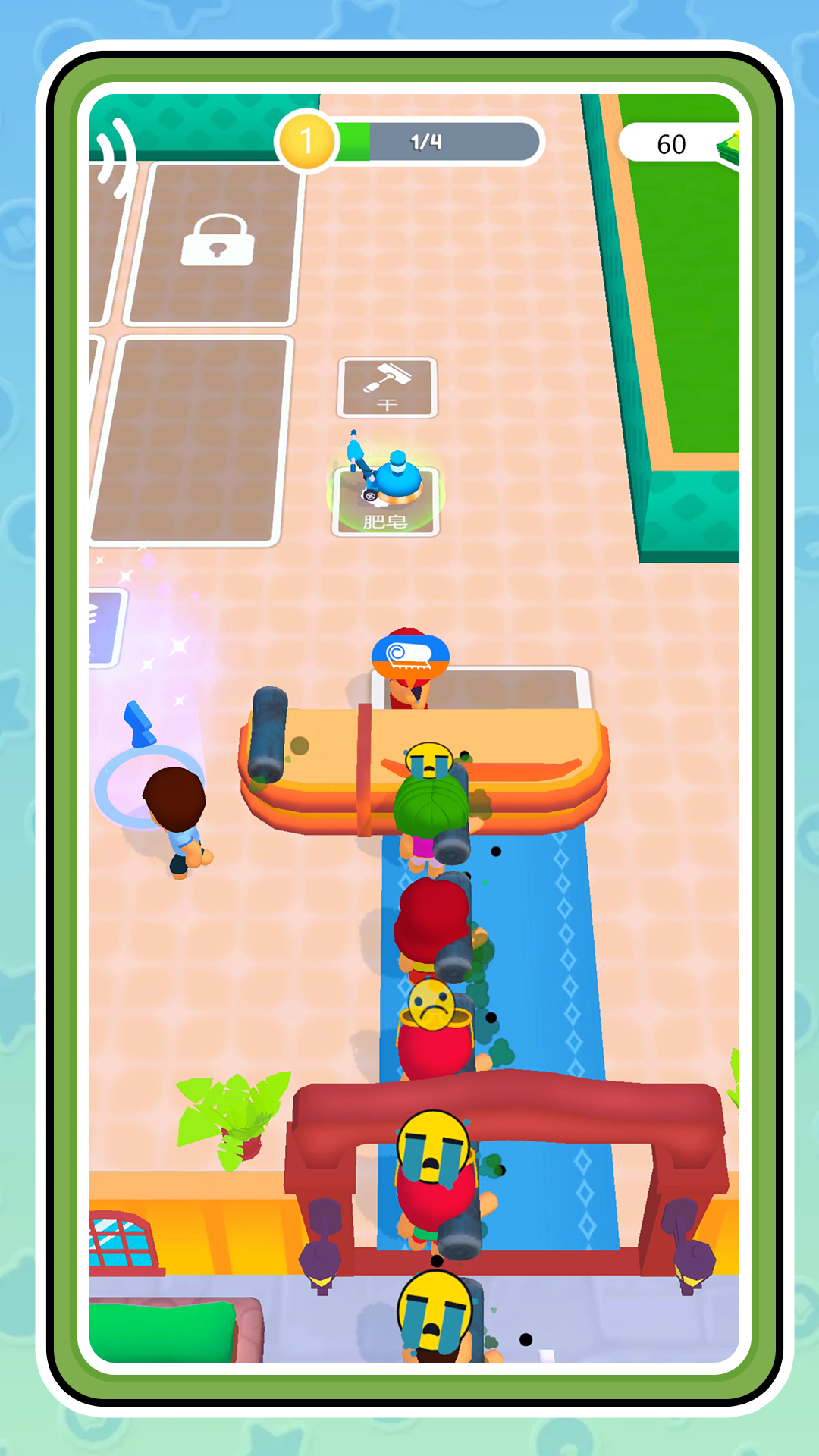 1、进入游戏,移动游戏中的角色收集金币开始接下来的任务,前往前台接受顾客需要清洗的物品。