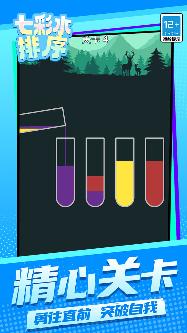 2、每个关卡中的试管数量以及颜色都不相同,合理规划好倒水顺序。