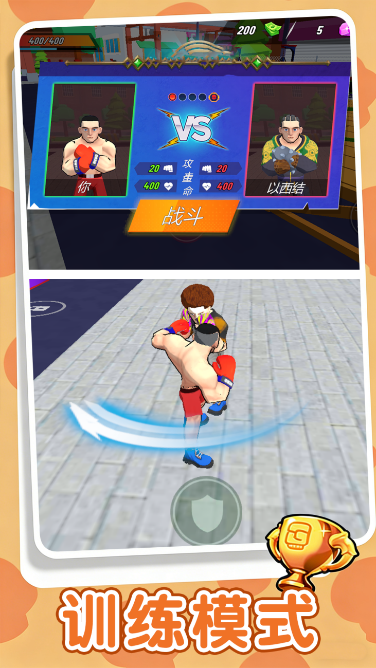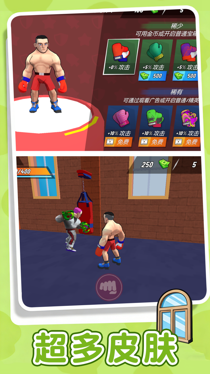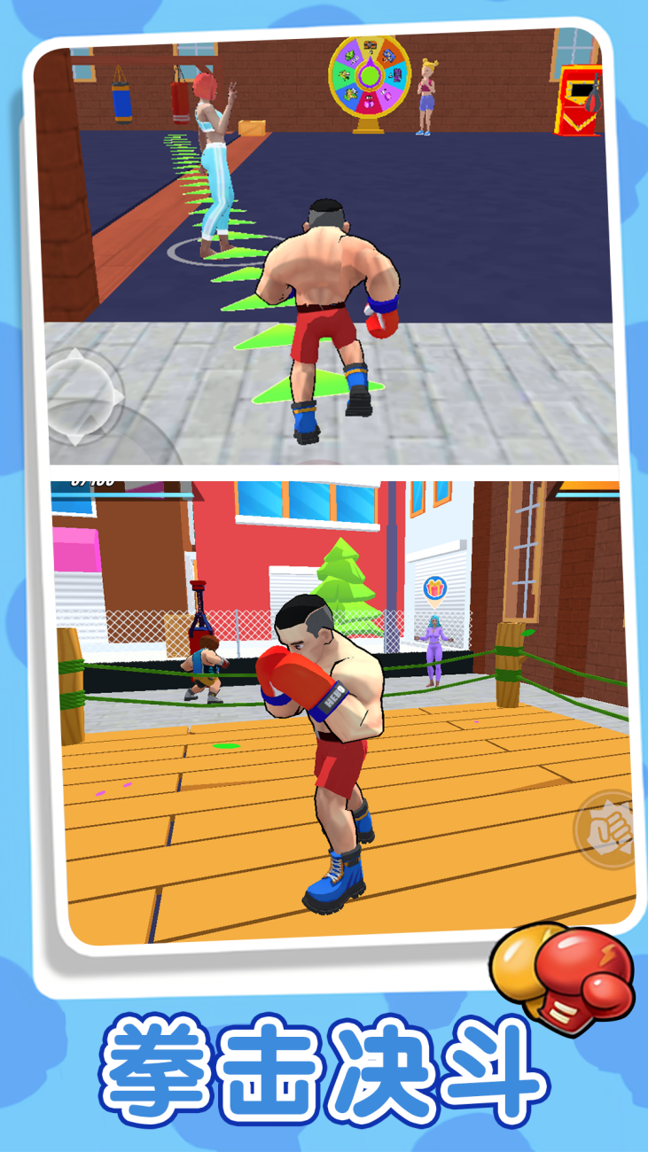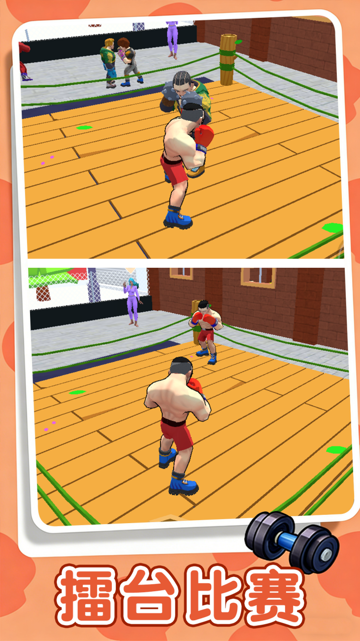 擂台对决大战是一款用你的拳头开始征服擂台的战斗闯关游戏,通过拳拳到肉的打击感、多样化的角色技能,让玩家在擂台上用拳头征服对手,体验热血沸腾的竞技乐趣。采用动作捕捉技术,还原直拳、勾拳、上勾拳等基础拳击动作,配合屏幕震动与慢镜头特写,强化击打时的冲击力,连续击中对手10次以上会触发全屏粒子特效,提升战斗爽快感。