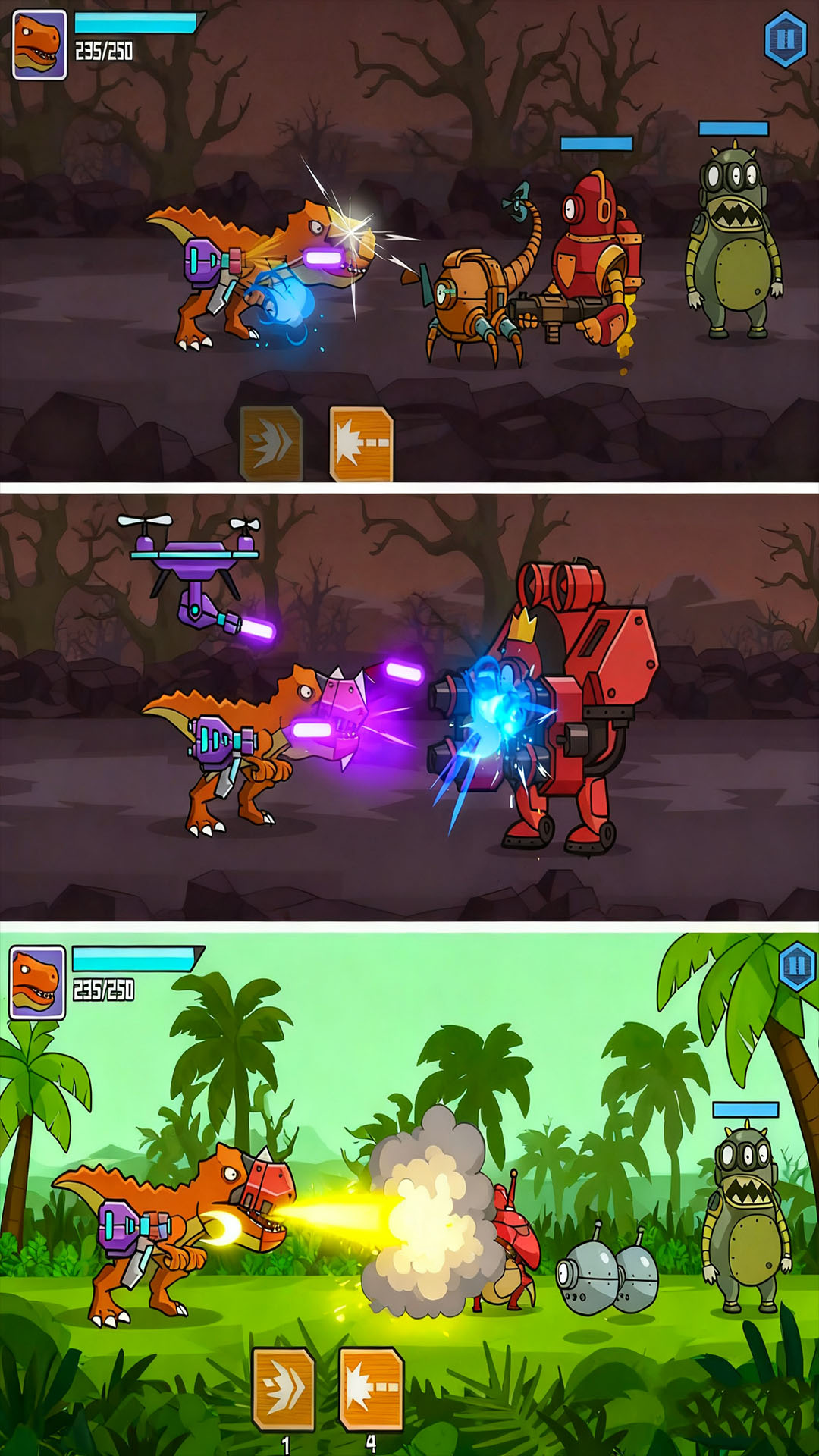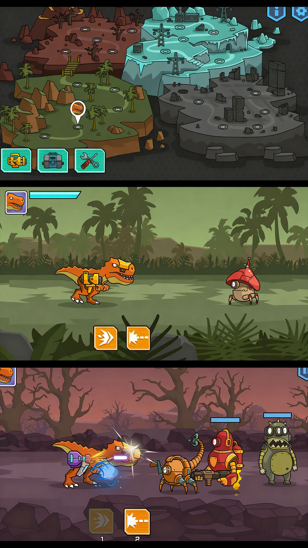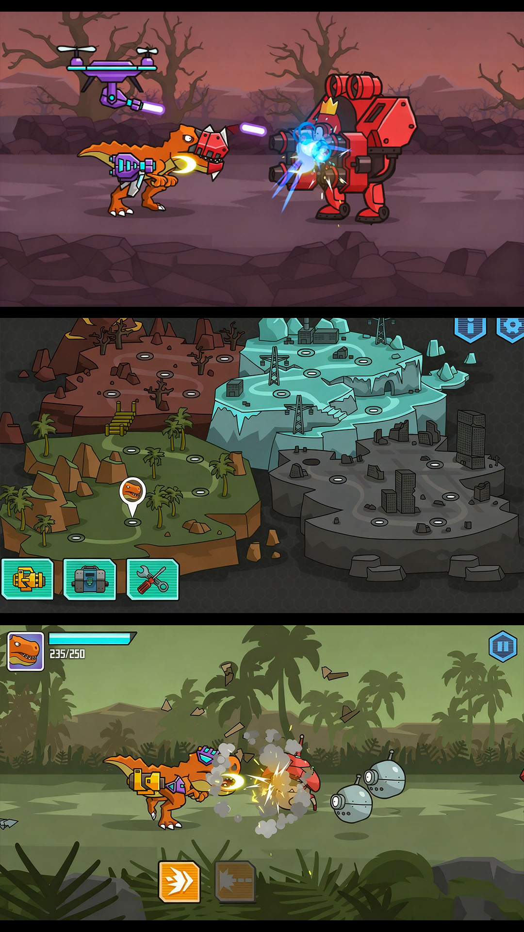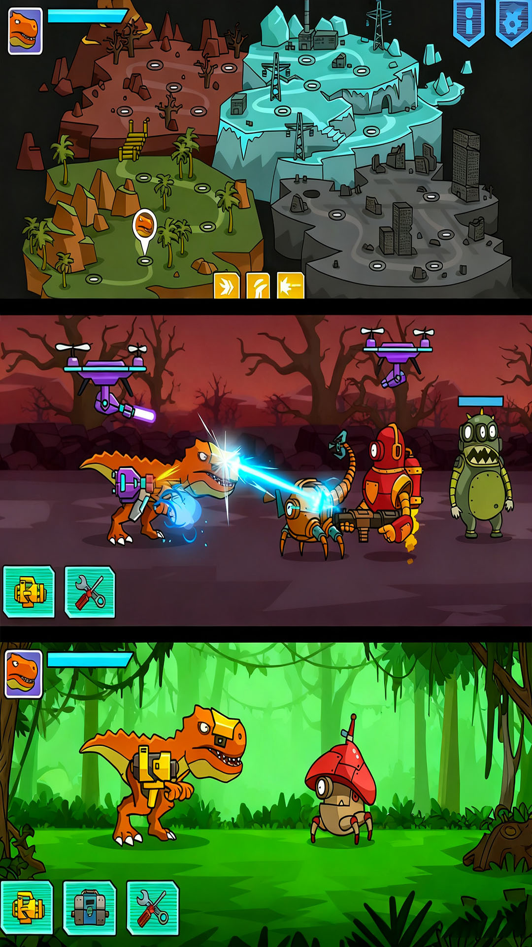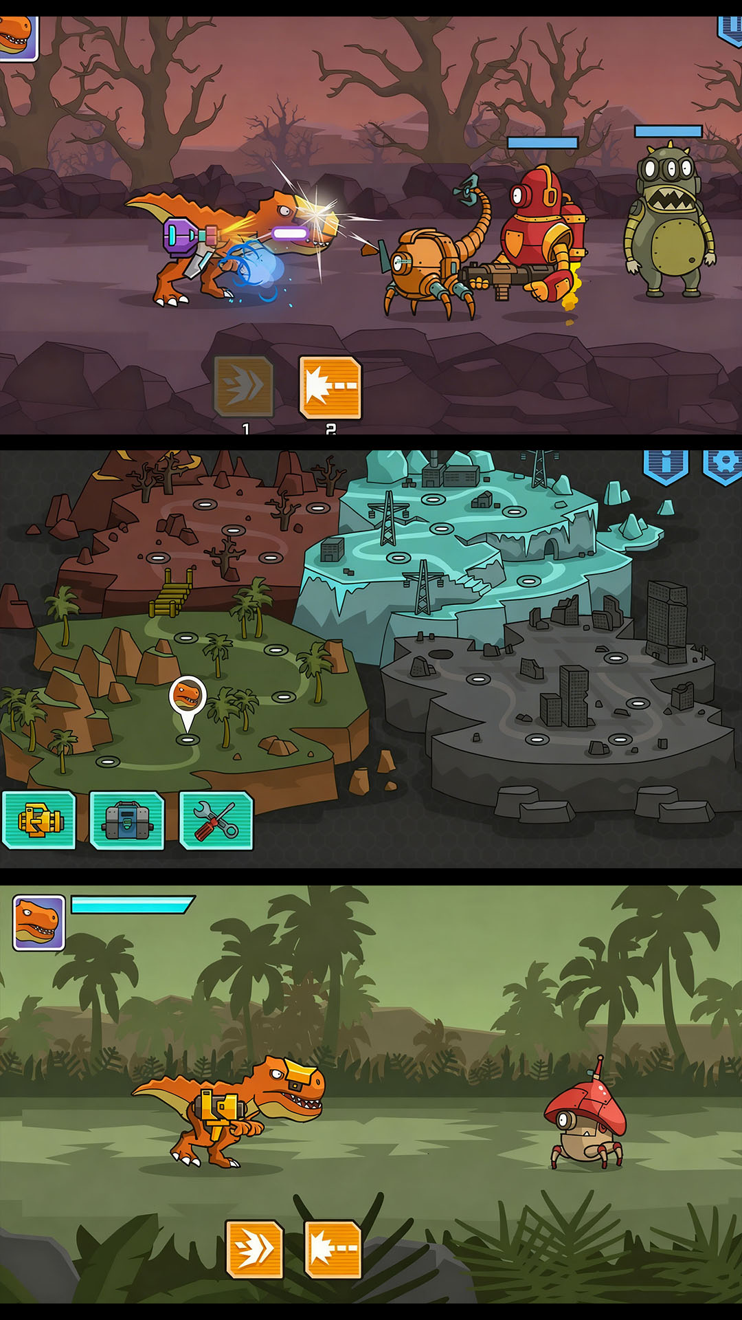 巨兽大冒险是一款打造钢铁巨兽,展开刺激作战的动作闯关游戏,你将化身一只战斗力拉满的赛博改造霸王龙,跟各种各样的机器人开始刺激的作战。玩家可自由组合霸王龙基因与未来科技部件,打造独一无二的钢铁巨兽,如为霸王龙安装等离子喷射尾翼提升冲刺速度,或植入电磁护盾增强防御力,甚至通过纳米修复技术实现战场自愈,强大巨兽成就无敌。