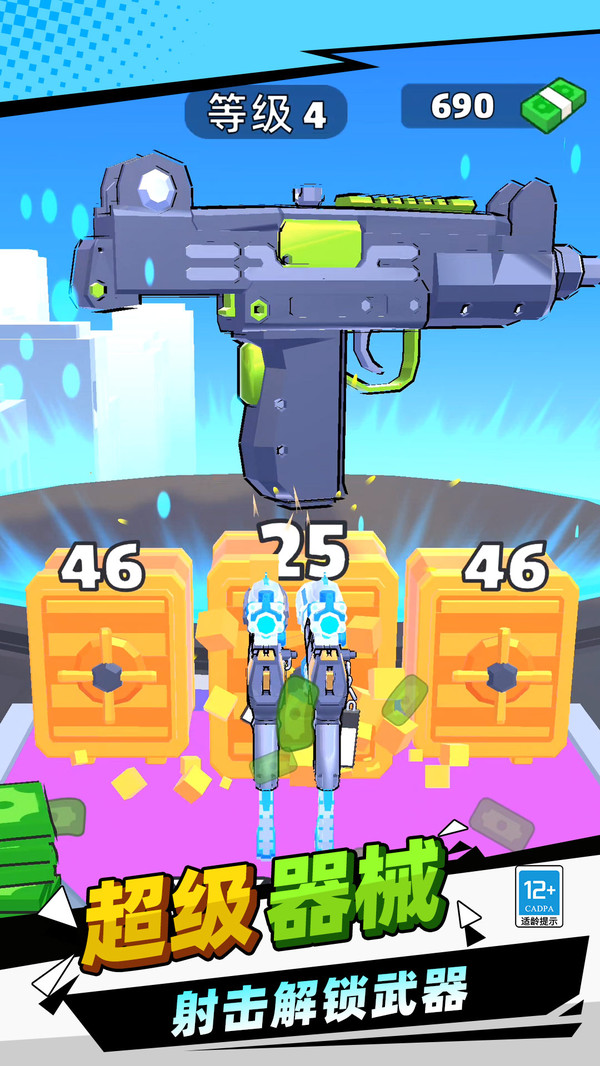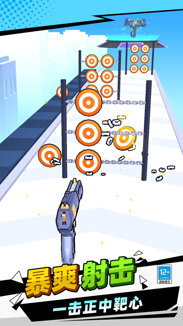 2、躲避障碍物到达终点,枪支会自动向前射击,击破更多柱子获得高额奖励。