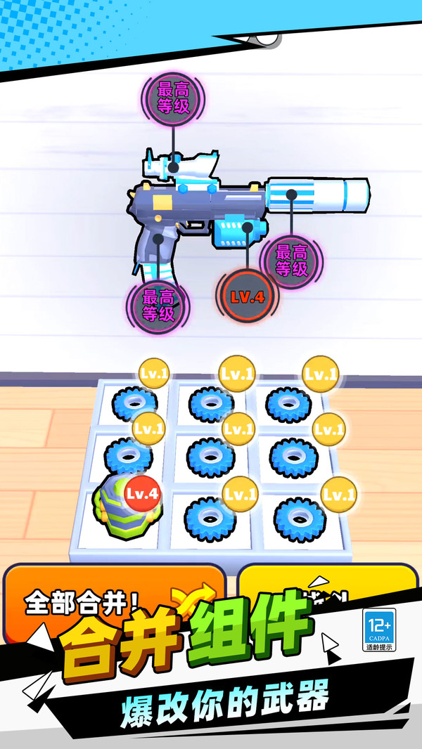 3、每个关卡开始之前,玩家都能购买枪支零件,进行合并打造更强枪支。
