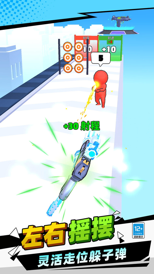 1、左右滑动屏幕控制枪支在跑道上移动,穿过增强枪支属性的门。