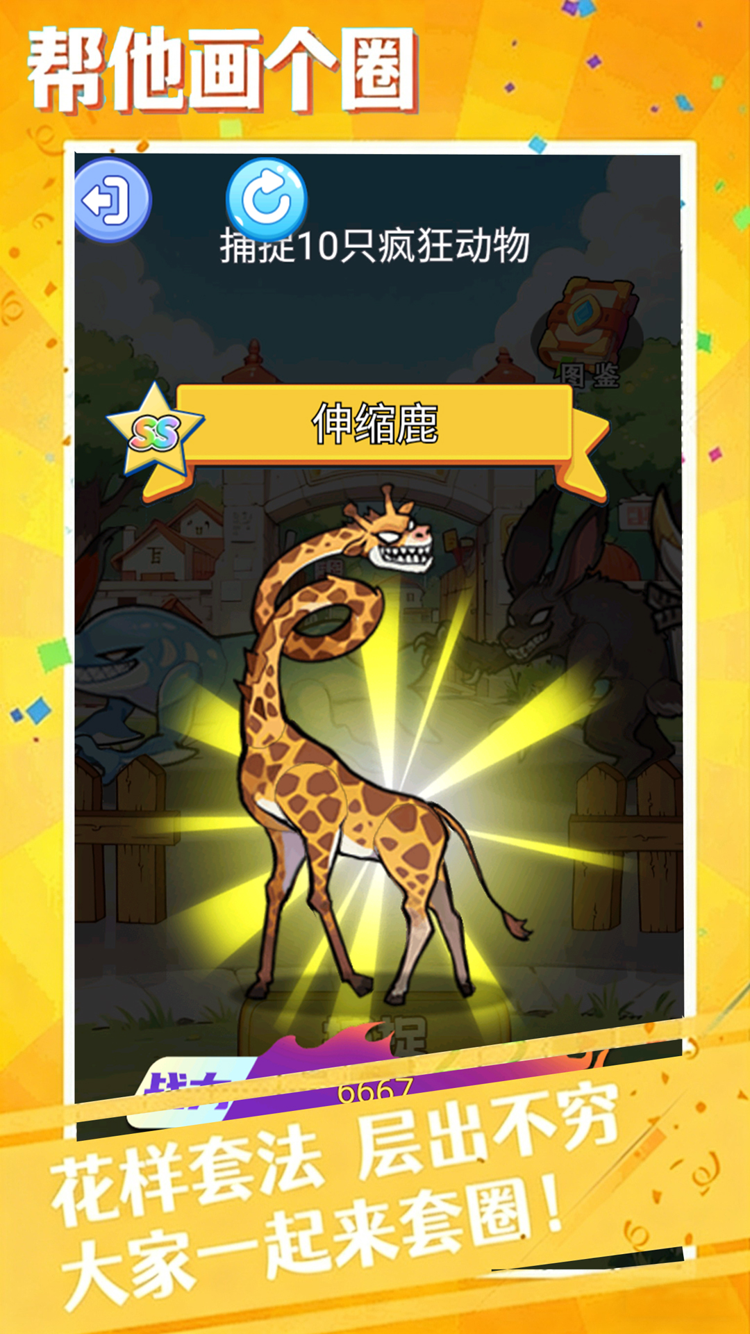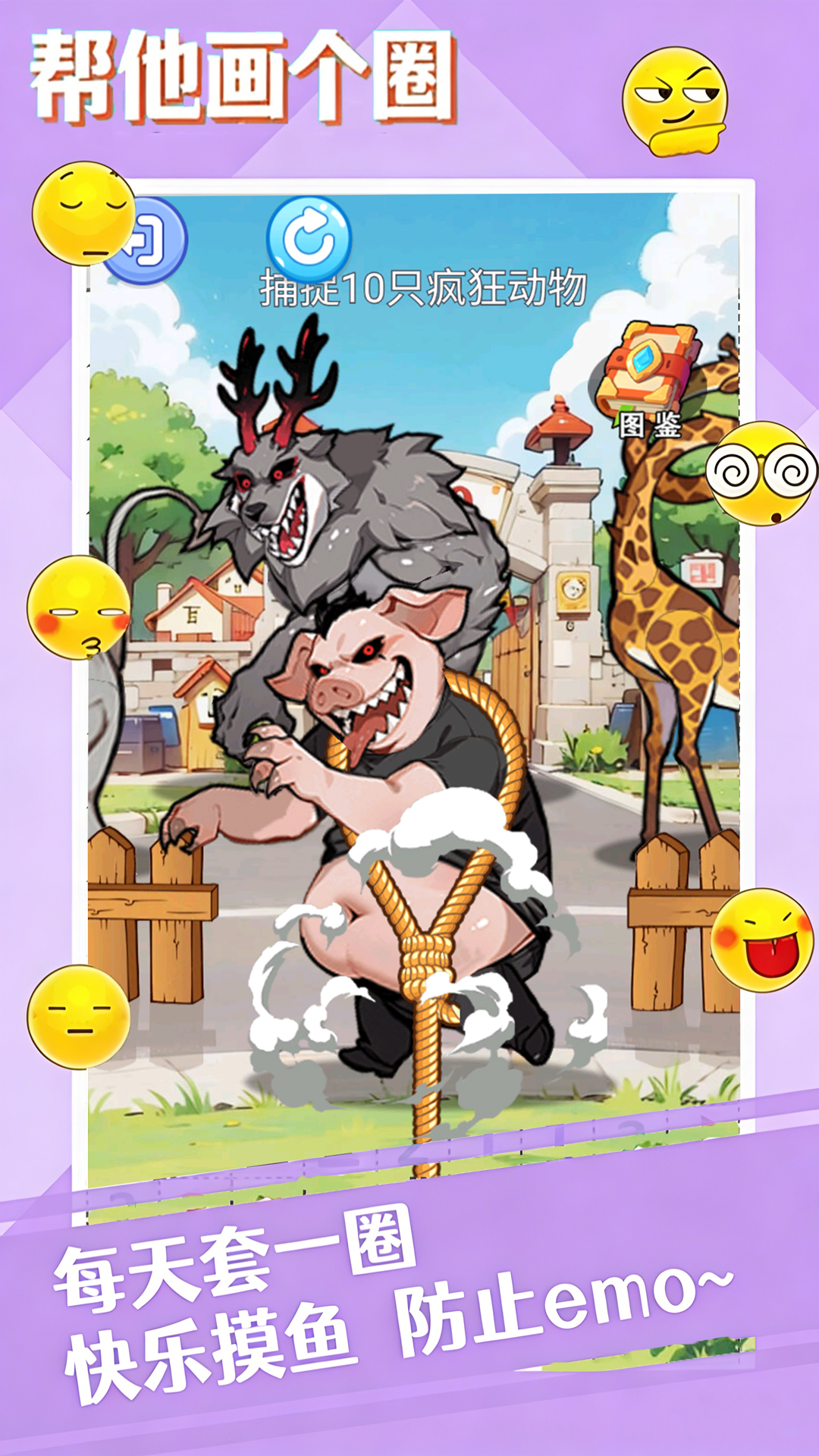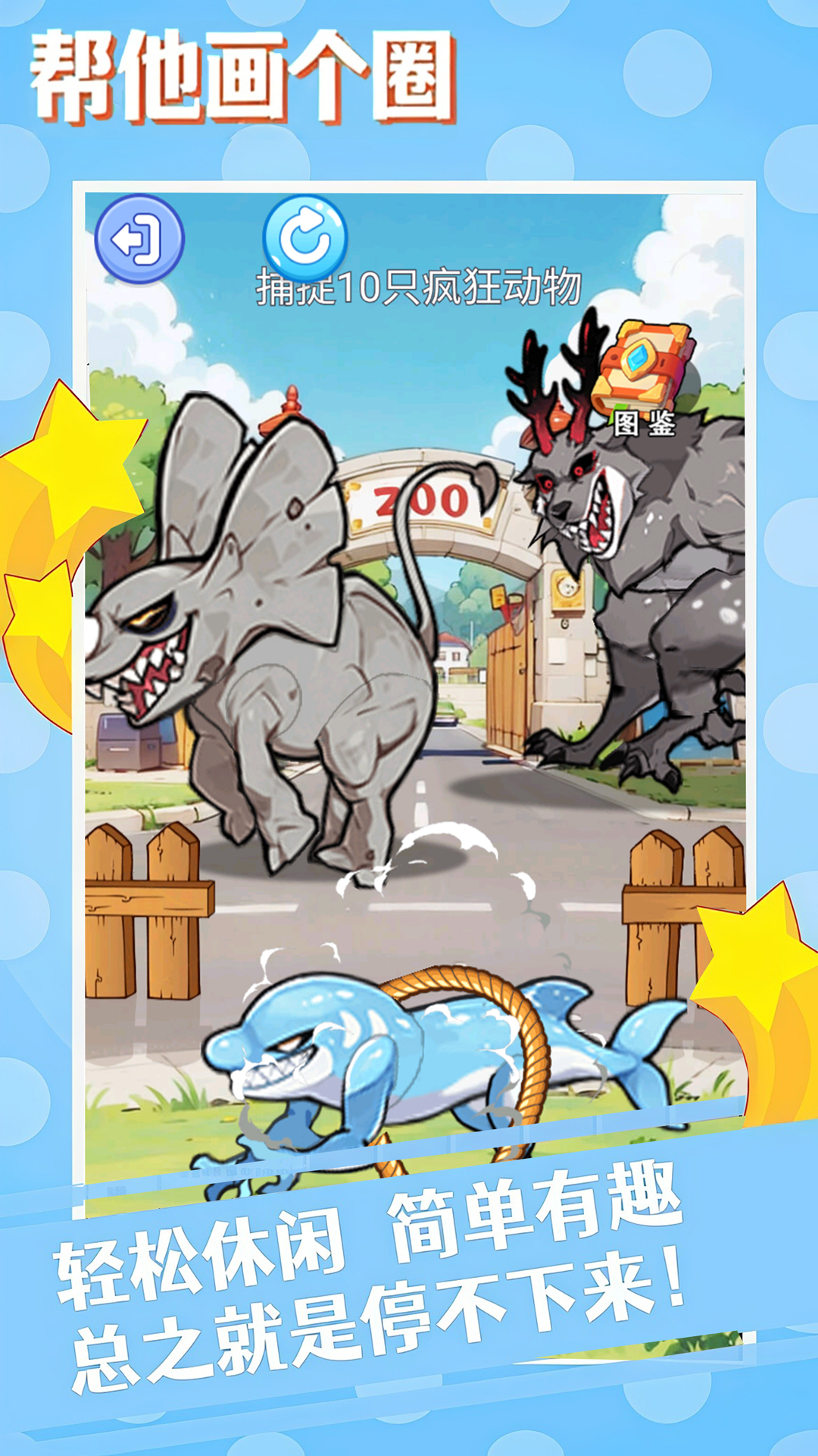 帮他画个圈游戏是一款充满趣味与挑战的休闲投掷游戏,将手绘艺术与精准投掷完美结合,带你进入一个妙趣横生的动画世界。在这里你可以用手指在屏幕上自由绘制任意形状的圈,然后瞄准那些活泼可爱的动物们进行投掷,无论是蹦跳的兔子、打滚的熊猫还是调皮的狐狸,都等着你来套中它们,解锁专属的动物图鉴。