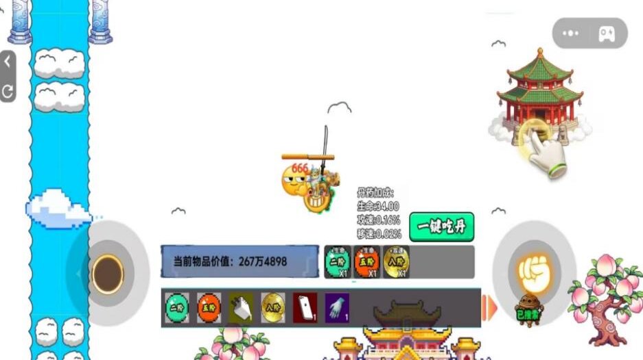 吃丹修仙1是一款能自由修仙的游戏,在不同的场景当中,开始你精彩的旅程,到处探索,寻找各种宝箱或者是其他物品,不断摸金,获取仙丹妙药,这些是能提升你的修为,变得更加强大,还有各种不同价值的物品能出售,带来一定收益,不过一路上会遇见很多敌人,随时都要小心,拿起手中武器进行作战,还能学习很多仙法,释放后爆发巨大威力,快来进行挑战吧!