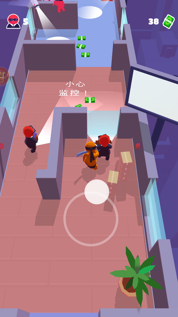 1、点击屏幕滑动控制忍者移动,在场景中利用掩体躲避敌人的视线。
