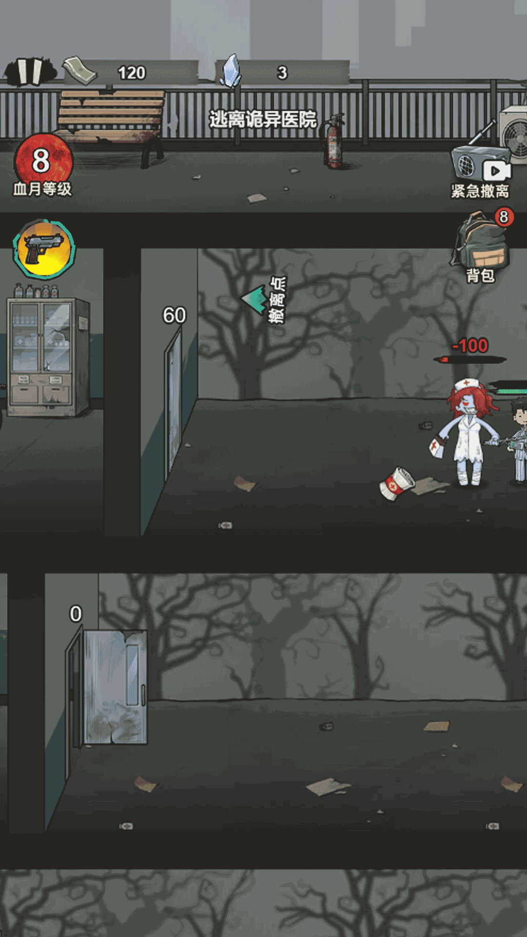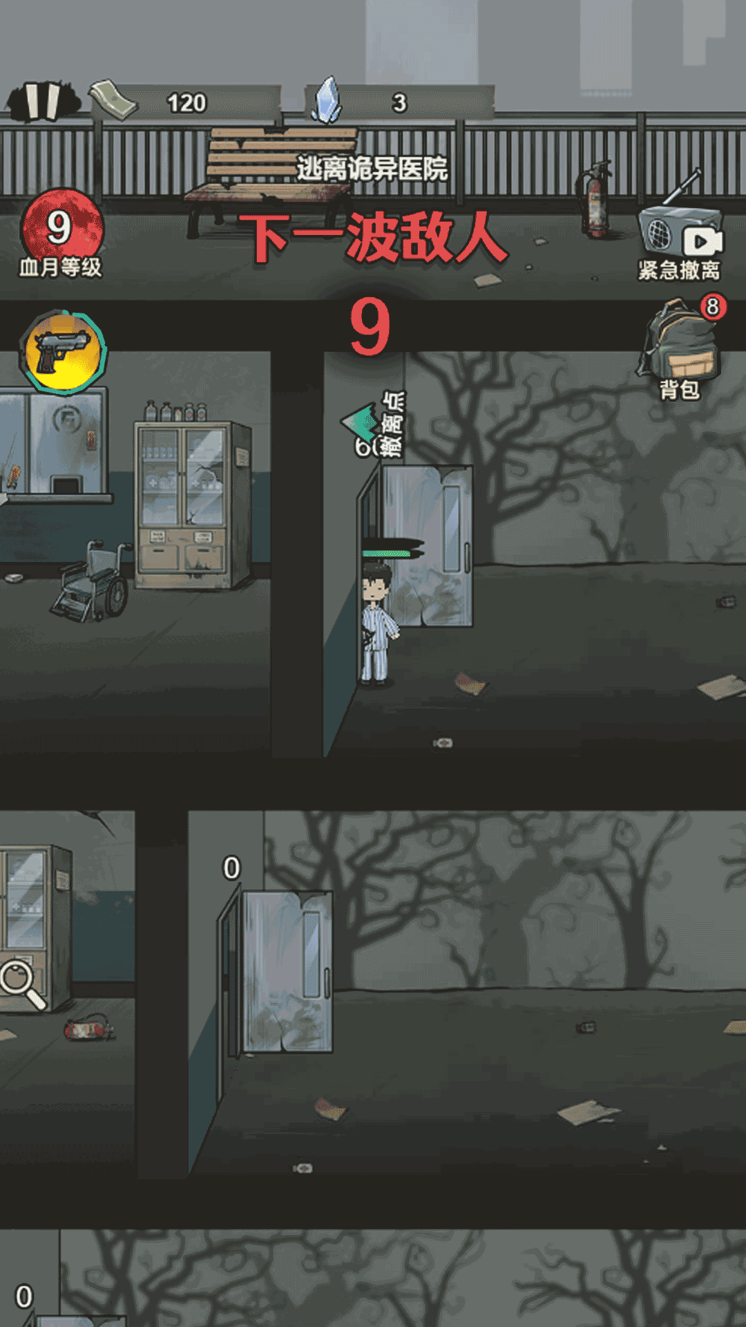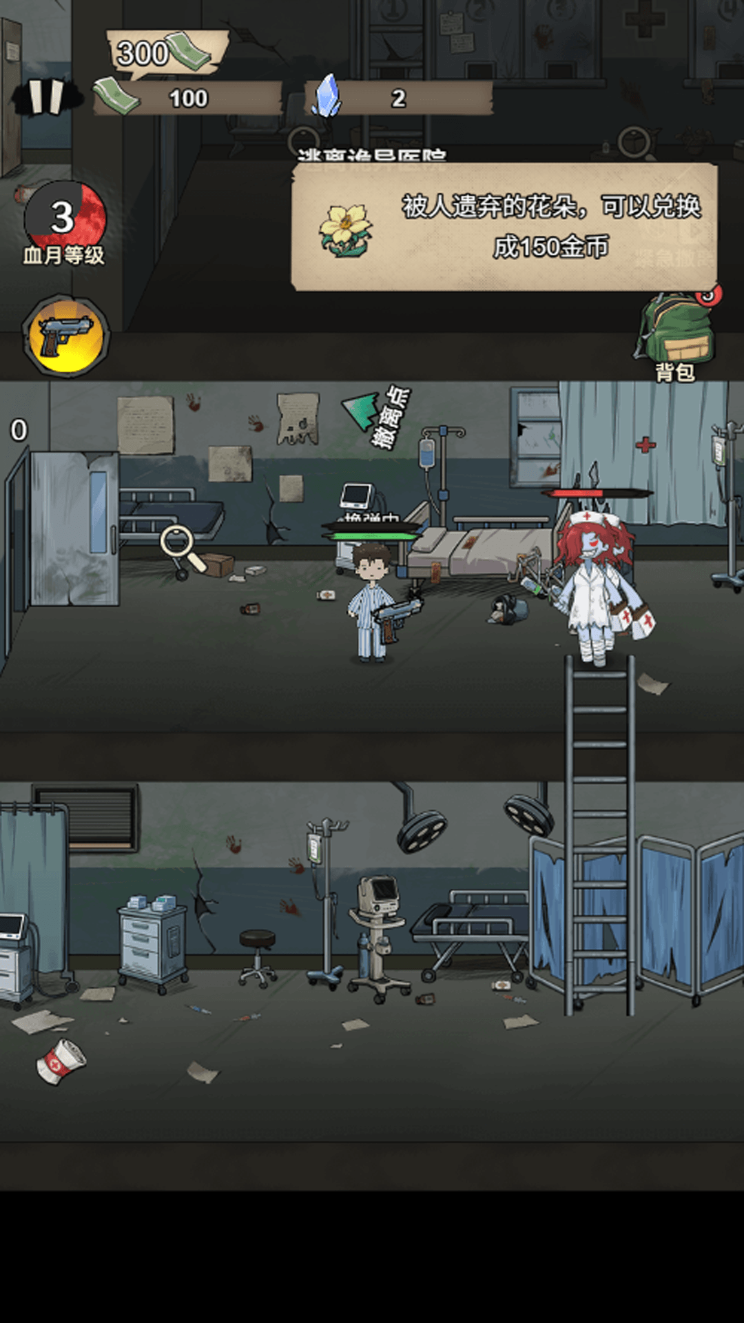 1、滑动屏幕控制角色移动,自动射击来袭的丧尸,探索场景。