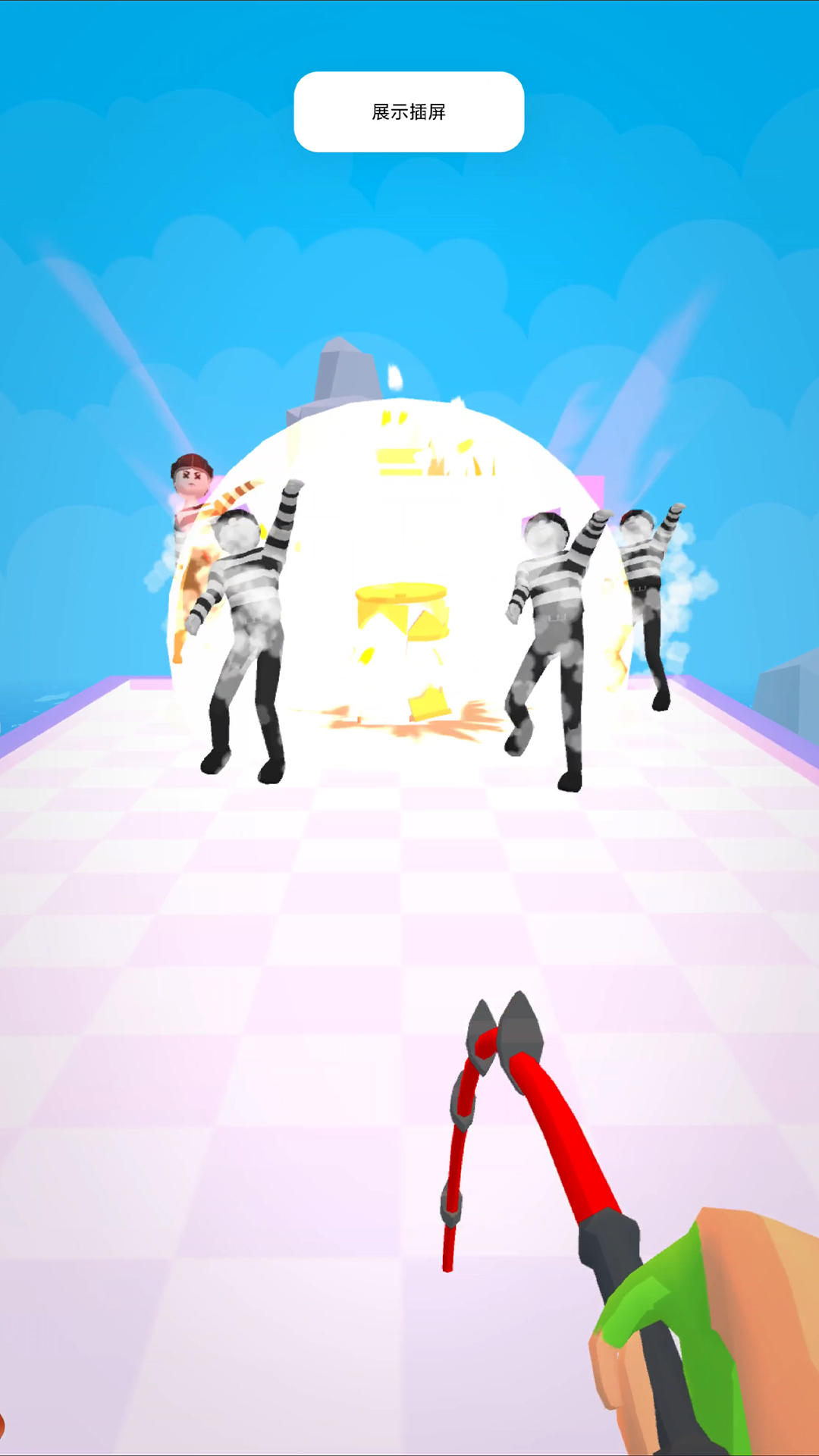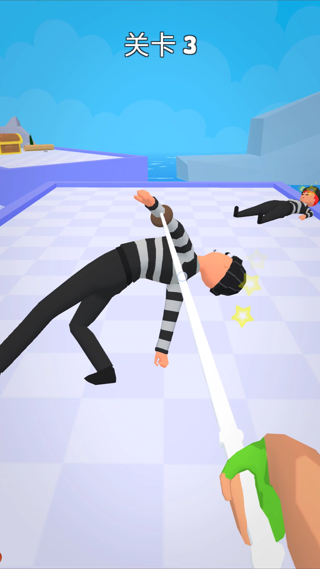 1、进入游戏,第一人称视角拿起绳索开始闯关,点击屏幕攻击沿路的敌人。