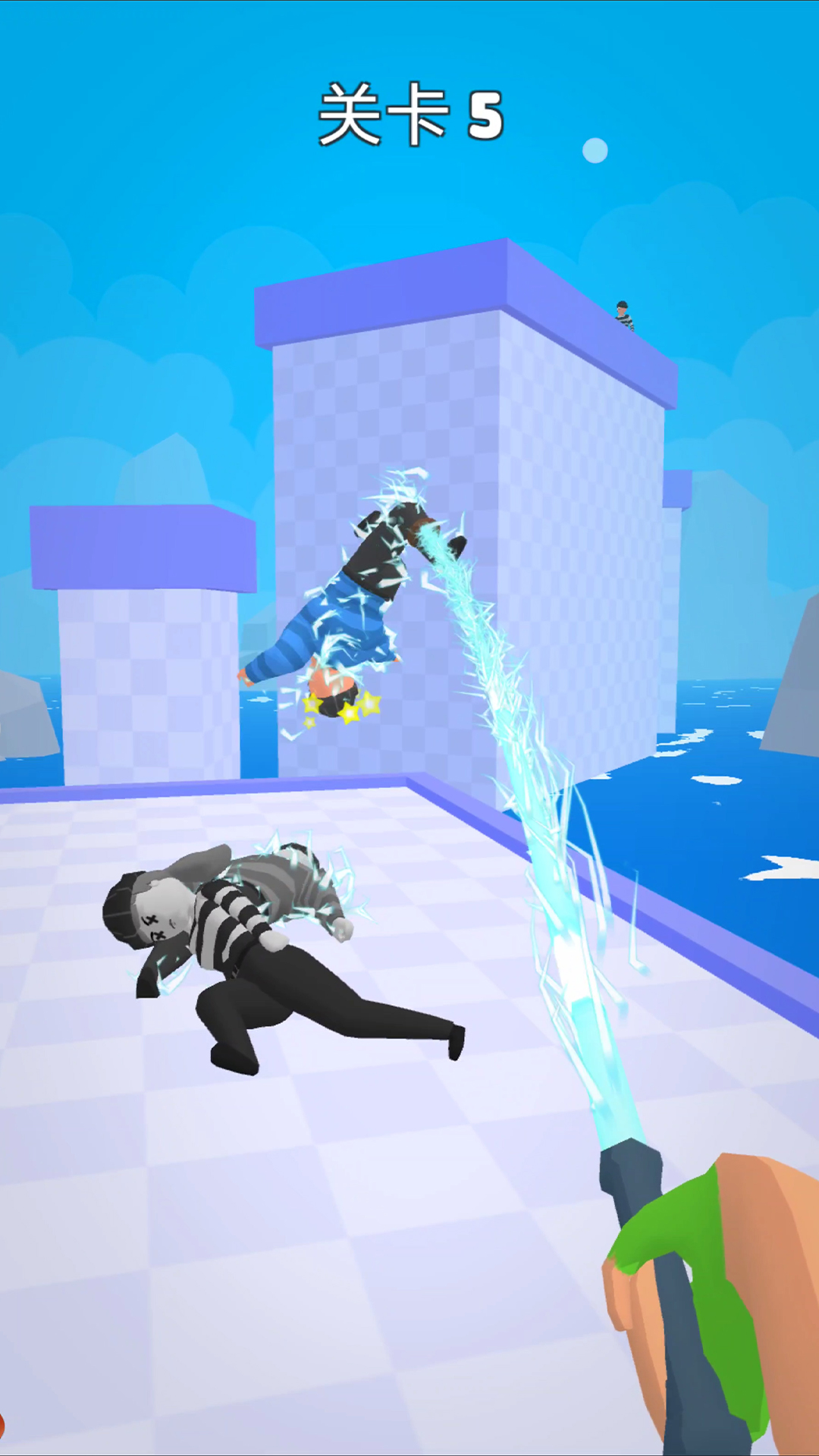 2、继续的移动迎战下一波的敌人,熟练使用你的绳索开始对战,点击屏幕甩开敌人。