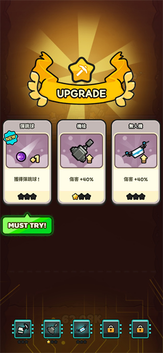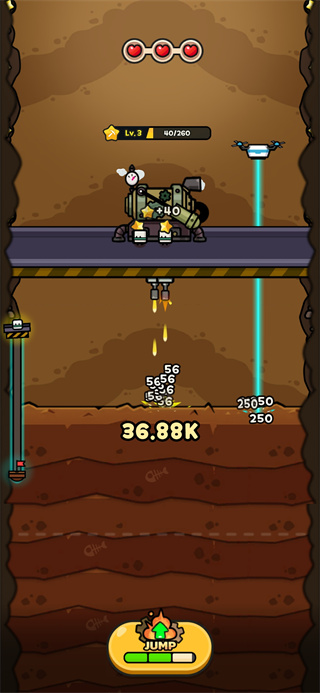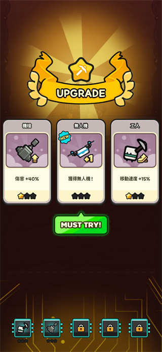 3、这款游戏也考验升级装备,玩家可以强化装备,包括无人机和导弹和机枪,或者解锁更好的钻头来挖掘你的道路。