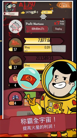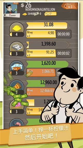 《资本家大冒险》是一款轻松休闲的放置类模拟经营手游,玩家将会从一间小小的柠檬汽水摊起步,玩家需要通过点击积累资本,雇佣经理自动经营,逐步扩张商业版图,最终建立横跨地球、月球乃至火星的星际商业帝国。