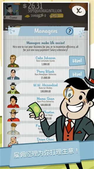 3、雇佣职业经理人帮你打理生意,即使玩家关闭游戏,你的财富也会持续增长,真正实现躺着赚钱;