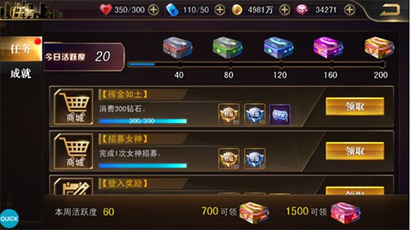 3、每天完成任务获得的活跃度,还可以累积起来解锁周活跃度奖励。当一周的活跃度达到700和1000的时候,都有超级丰厚的奖励可以领,更有高级召唤券在等你噢!