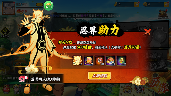 游戏对新玩家的友好程度堪称典范。你完全不用经历漫长而痛苦的“开荒期”,因为角色一创建成功,系统会直接把你的VIP等级拉到12级,还附赠整整500次抽卡机会,让你瞬间就能组建一支像样的队伍。更给力的是,开局就送顶级的SP仙人鸣人,这位强力伙伴会陪着你轻松扫平前期的各种障碍。