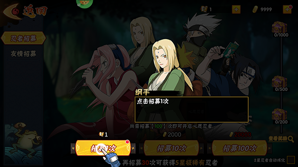 2、口袋里有了资源,接下来最让人兴奋的环节就来了——招募属于你自己的忍者小队!去召唤界面试试手气吧,那些传说中的三忍、晓组织的狠角色,都有机会成为你的伙伴,让你的阵容迅速强大起来。