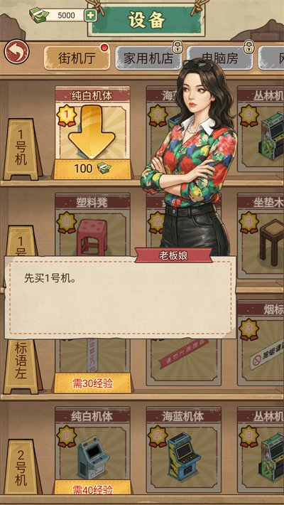 1.、咱们开张第一步,得先有家伙事儿才行。你看,点击屏幕下方的设备按钮,就能进入采购菜单了。先别贪多,挑一台看起来最顺眼的游戏机,买下它,这就是你梦想起航的第一块基石。