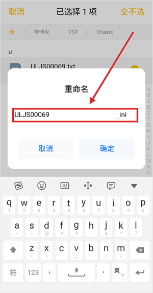 4、打开手机的文件管理功能,并进入到上述文件夹中,找到刚才的TXT文件,并将其重命名为【ULJS00069.ini】(这里很重要,文件名的任何一个字符都不能错,包括ini后缀名,否则游戏可能无法识别此金手指文件)。
