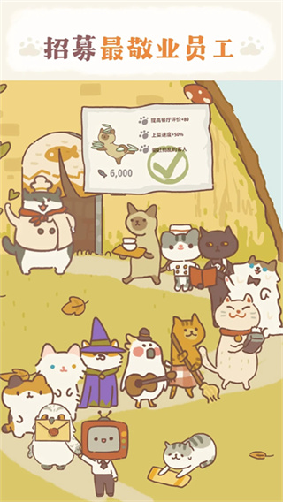 7、进入员工界面,可消耗小鱼干雇佣不同职能的猫咪员工;
