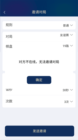 4、接下来会进入对局设置界面。在这里,你可以详细设定这次对弈的各项规则,比如棋盘大小(19路、13路或9路)、执子方式、让子数量、每方用时、读秒时间和次数等等。全部设置妥当后,点击“邀请”发送给朋友就行了。