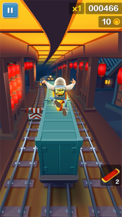 2、操控角色在铁轨上向前奔跑,通过滑动屏幕躲避火车、障碍物,同时收集金币与道具。