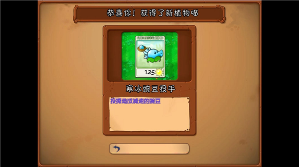 4、打个比方,这次我们就抽到了一张寒冰豌豆投手。这和原版冒险模式里直接解锁特定植物的方式很不一样。