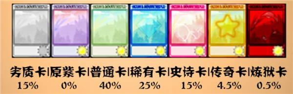 获取概率仅为4.5%的橙色传奇卡极为稀有,如尖刺大喷菇、天使星星猫、三头向日葵、三头机枪射手、随机变化胆小菇、猫猫星机枪。