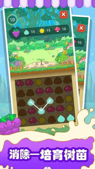 2、在培养树成长的过程中需要土壤、水分、阳光和肥料这些养分,每一棵树需要用到的养分都不一样,可以通过消除玩法来获取养分;、