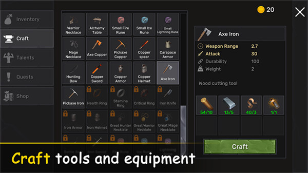 4、可以用简单材料制作斧头、弓箭、陷阱等工具,提高采集效率和防御能力,增加玩法体验;