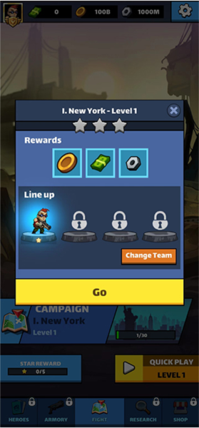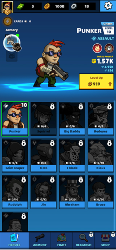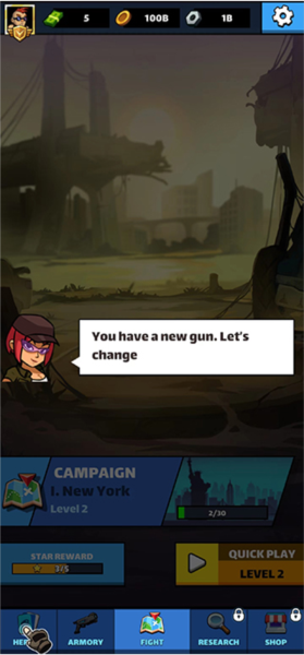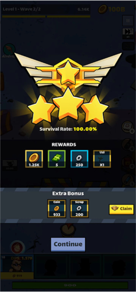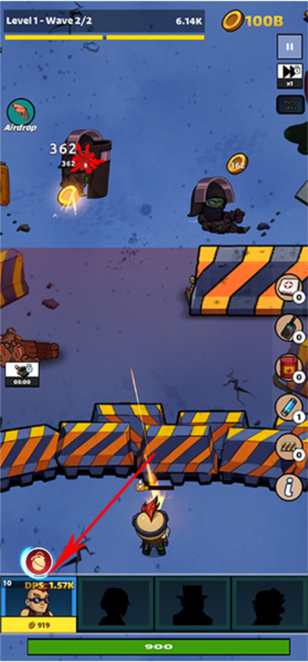 3、进入关卡后,战斗就开始了。你可以随时点击你的角色,消耗金币来提升武器的威力。如果遇到一大波僵尸处理不过来,别忘了使用屏幕下方的炸弹等道具,瞬间清场。