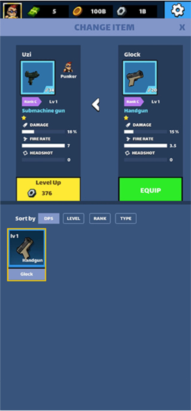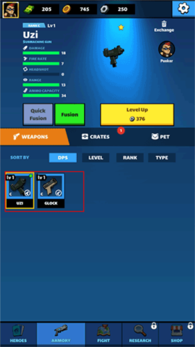 6、切换到枪械分页,你可以在这里为你的英雄换上更厉害的武器。别忘了,你还可以对已装备的武器进行投资升级,让它的火力更上一层楼。
