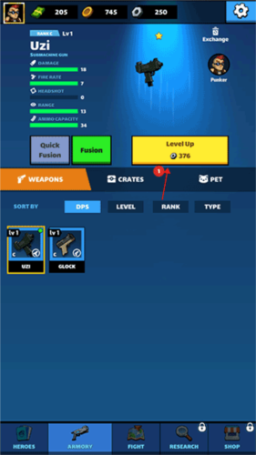 3、想要升级的话,只需点击图中箭头所指向的那个升级按钮,消耗相应的资源就可以提升枪械的等级和威力了。