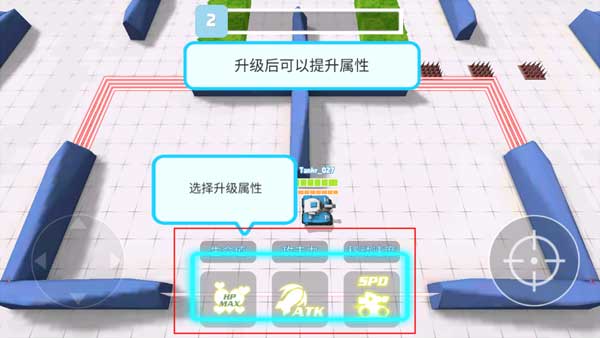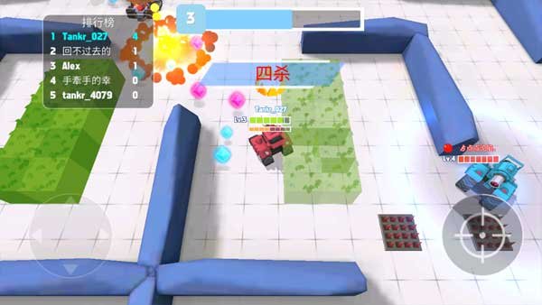 2、操作逻辑简单粗暴,左手摇杆控制坦克满地跑。地图上到处都是蓝色水晶,多吃点,这玩意是经验值,能让你变强。
