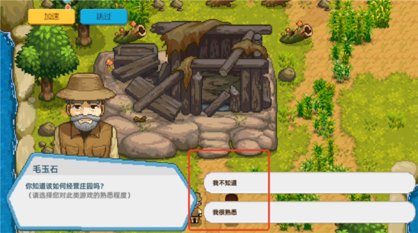 4、你的青梅竹马离开后,奶牛镇的镇长就会过来,为你进行新手教学。你可以根据自己对这类游戏的熟悉程度来选择,选“熟悉”教程就会简单些,选“不熟悉”则会教得更详细。