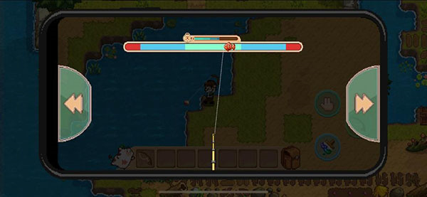 4、当鱼成功咬钩后,你需要同时留意三个地方:鱼游动的方向、鱼线的偏向以及鱼所在区域的颜色。这三点共同决定了你能不能把鱼成功拉上岸。钓鱼成功的关键就是把鱼一直控制在屏幕中间的区域。举个例子:如果鱼往左边跑,导致鱼线也向左偏,我们就要赶紧点击右边的按键,这样就能把鱼拉回来。根据这个原理,应对不同的情况就行了。