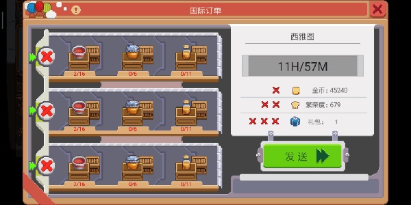 普通订单需要的货物是固定的,只要你凑齐物品点发送,就能完成并拿到固定的金币和繁荣度。