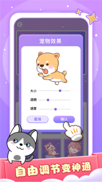 2、软件提供了极高的自由度,宠物的大小、透明度都可以随心调节,打造专属体验。