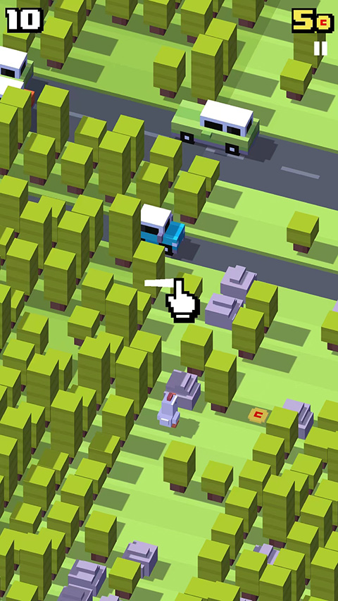 1、这游戏没啥关卡,就是一条道走到黑的无尽模式。你要做的就是帮小家伙穿马路,躲车。手指在屏幕上上下左右划,角色就跟着往哪儿跳。分数只跟你往前走了多少步有关,往左右平移不加分,往后退也不扣分。