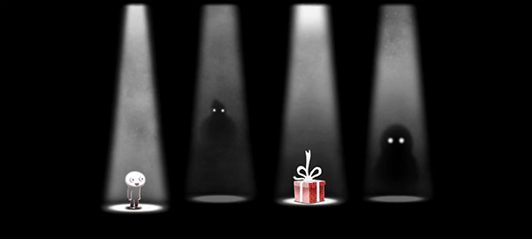 2、可他一躺下,噩梦就开始了。四周黑漆漆的,只有一束光打在小男孩身上。你就得带着他在黑暗里摸索,很快就会发现前方有一束光照着一个礼物盒。