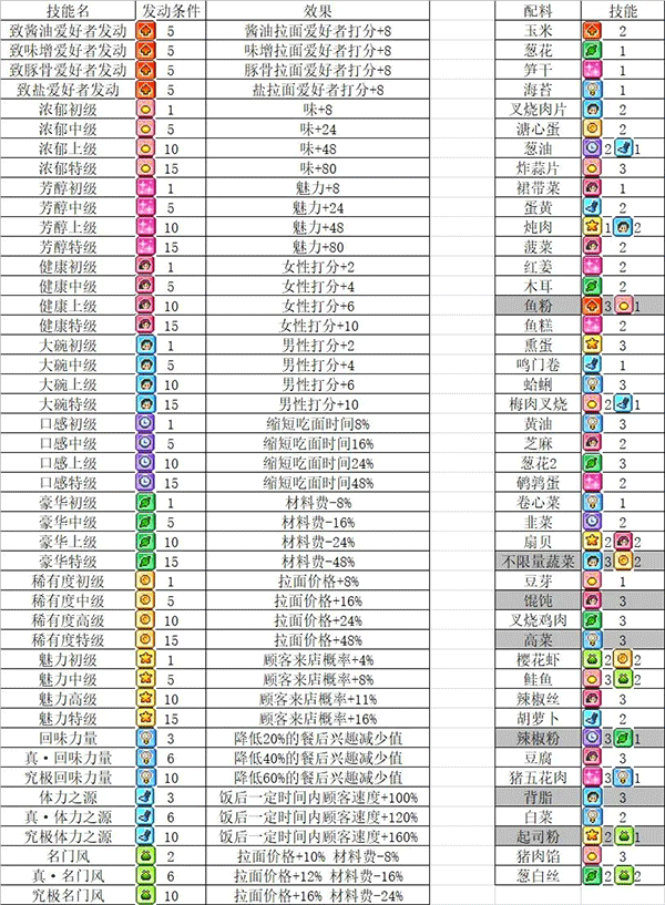 图里灰色背景的那些配料是买不到的稀有货。那个“致XX爱好者发动”的技能,就是你做的是什么类型的面,就能吸引哪类爱好者。