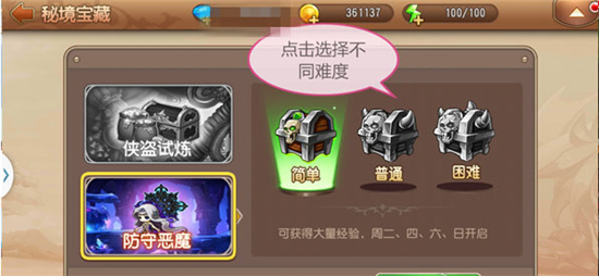 秘境宝藏分两种模式,每周一、三、五开放的是“侠盗试炼”,能刷一大堆金币;每周二、四、六开放的是“防守恶魔”,能毛一大堆经验。每天只能打两次,次数别浪费了。