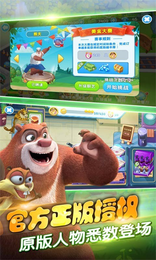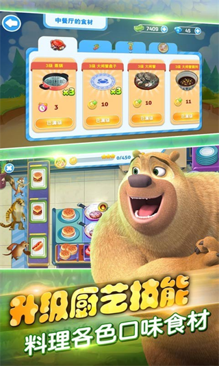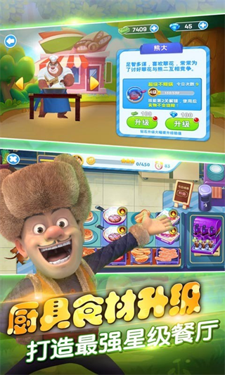 《全民熊出没》是一款参考知名动漫熊出没的角色而出来的游戏,里面三位出名的角色将会在店里当一位厨师,售卖食物给好朋友好伙伴,有趣的动漫再配上有趣的游戏,不止适合小朋友玩,也适合大朋友下载来当休闲时间的娱乐选择。