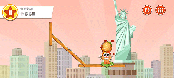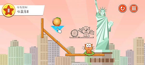 5、你的目标就是想办法让汉堡一路滚到小猫的旁边,这样它就能美美地饱餐一顿。