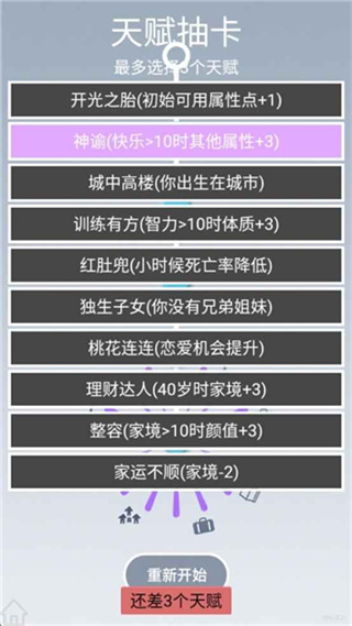 人生规划攻略是一款以纯文字的人生模拟养成游戏,玩家会扮演故事的主角,以做选择去影响故事走向,开局会先抽取天赋,天赋组合会影响初始优势,天赋五大核心属性为体力、智力、情商、财富和声望,天赋属性数值将直接影响结局,游戏进度以角色每年经历的事情,每年会有1到3个关键时刻,玩家需要根据题目做出决定,每个决定都会影响数值与后续发展,可随意按心态选择,答案没有对错。